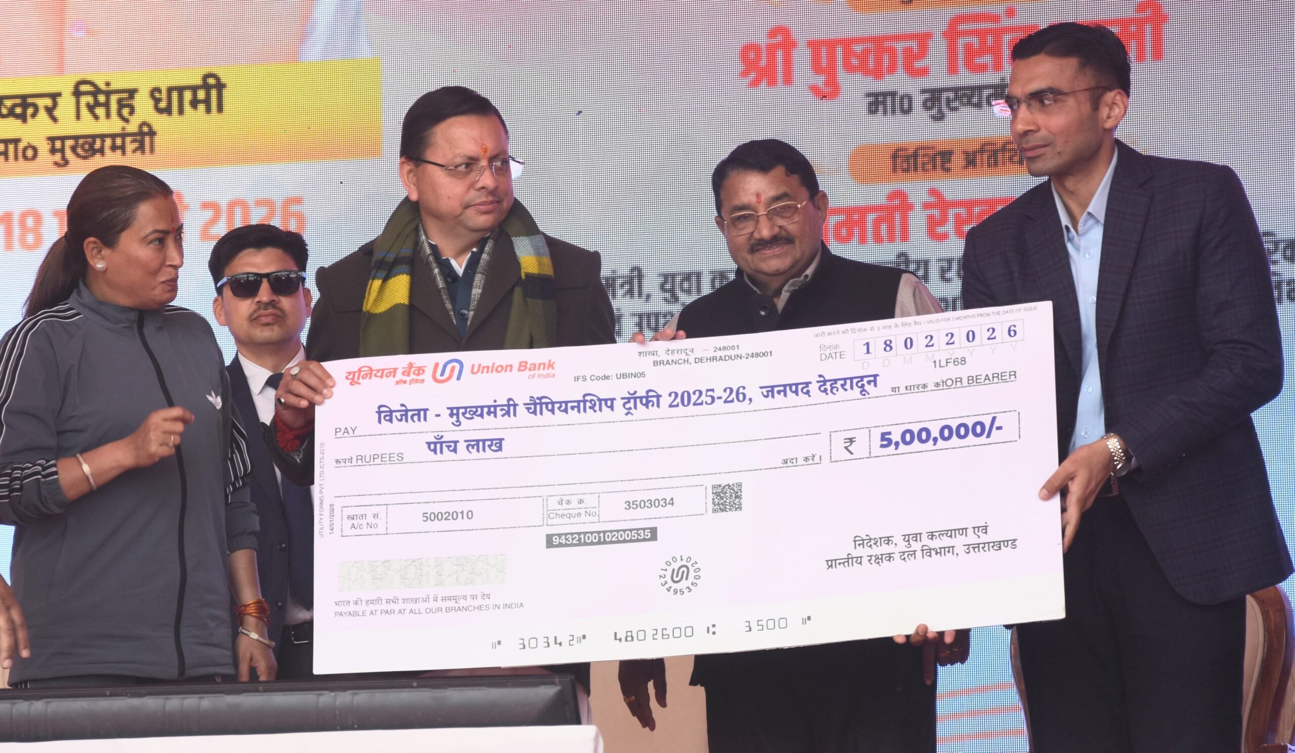 देहरादून, 18 फरवरी। ननूरखेड़ा मिनी स्टेडियम में आयोजित मुख्यमंत्री चैंपियनशिप ट्रॉफी 2025-26 के राज्य स्तरीय मुकाबलों में देहरादून जनपद की टीम ने शानदार प्रदर्शन करते हुए खिताब अपने नाम किया। विजेता टीम को मुख्यमंत्री पुष्कर सिंह धामी और कैबिनेट मंत्री रेखा आर्या ने ट्रॉफी एवं 5 लाख रुपये का चेक प्रदान कर सम्मानित किया।