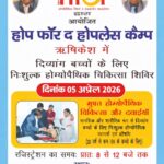 ऋषिकेश। प्रफुल्ल विजयकर होम्योपैथिक रिसर्च व डेवलपमेंट फाउंडेशन (एचआरओएफ) द्वारा ‘होप फॉर द होपलेस’ कैम्प के तहत दिव्यांग बच्चों के लिए निःशुल्क होम्योपैथिक चिकित्सा शिविर का आयोजन किया जा रहा है। यह शिविर 5 अप्रेल 2026 को भक्त निवास, कैलाश आश्रम, मुनि की रेती, ऋषिकेश में आयोजित होगा।