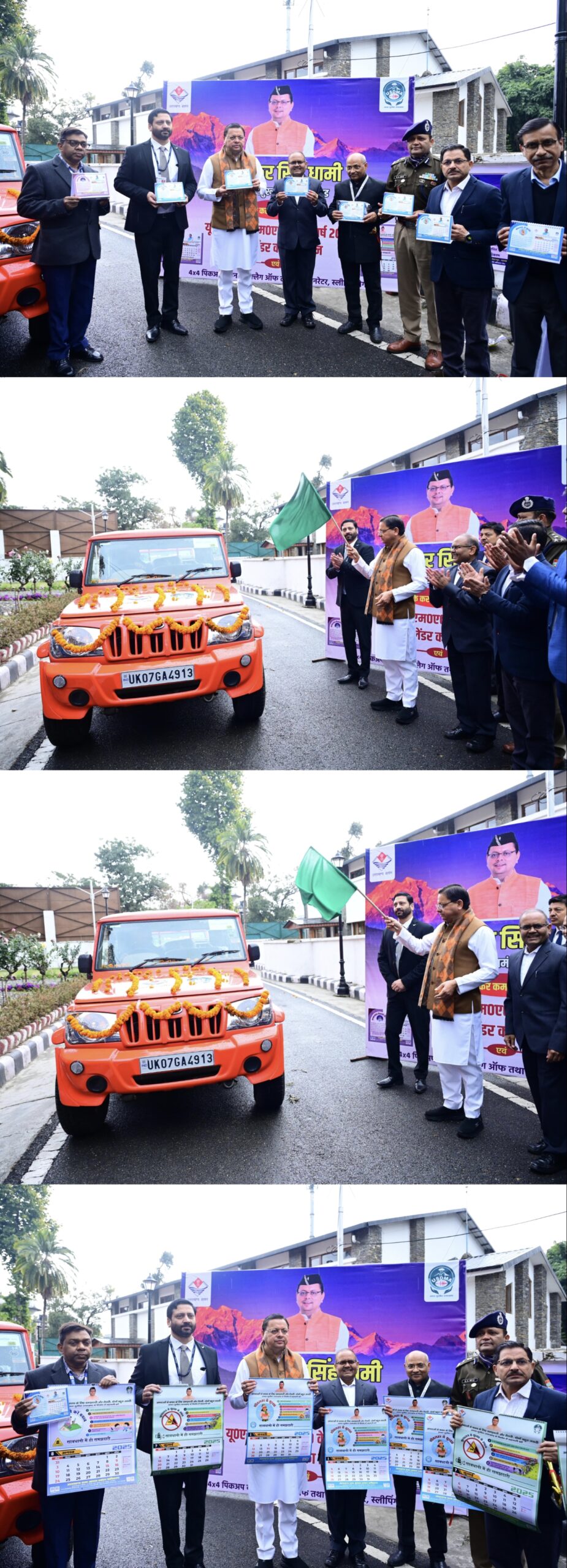 मुख्यमंत्री पुष्कर सिंह धामी ने गुरुवार को यूएसडीएमए के नव वर्ष 2025 के कैलेंडर (वॉल तथा टेबल टॉप) का विमोचन किया। उन्होंने चम्पावत, रुद्रप्रयाग, चमोली और ऊधमसिंहनगर जनपद के लिए सीएसआर मद में प्राप्त 04 पिकअप वाहनों को हरी झंडी दिखाकर रवाना भी किया। इन वाहनों में टैंट, स्लीपिंग बैग, लीफलेट तथा कैलेण्डर रवाना किए गए। इन फॉर बाय फॉर पिक अप वाहनों में 01-01 मिनी जनरेटर, 15 स्लीपिंग बैग एवं 70 टैंट तथा आकाशीय बिजली से बचाव हेतु 9500 लीफलेट एवं 40-40 नव वर्ष कैलेण्डर उपरोक्त प्रत्येक जनपद को भेजे गए। यह वाहन तथा अन्य उपकरण जनपदों में आपदा के दौरान राहत और बचाव कार्यों के लिए उपयोगी साबित होंगे।