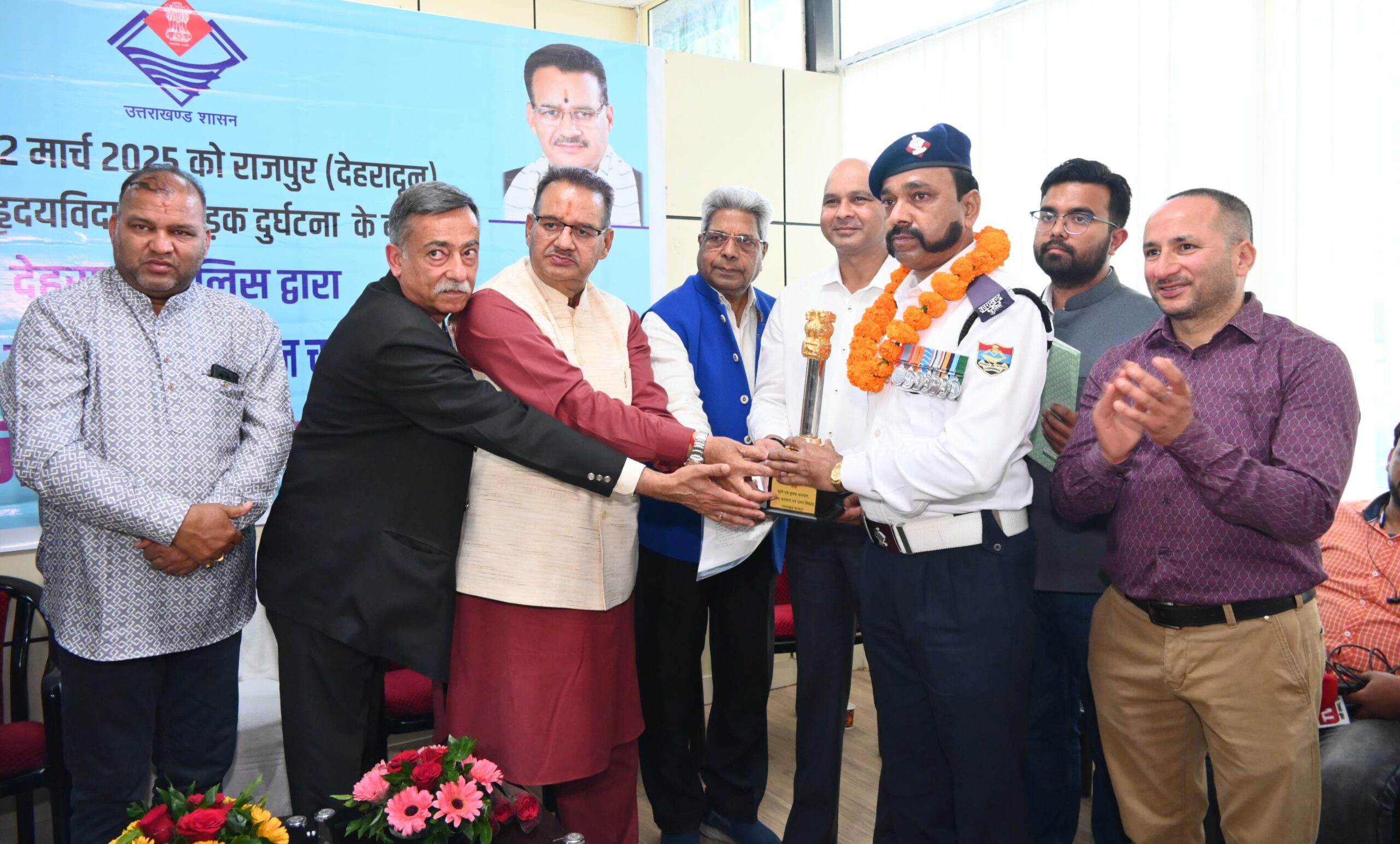 देहरादून में हुई सड़क दुर्घटना के शीघ्र अनावरण पर देहरादून पुलिस टीम को सम्मानित करते कैबिनेट मंत्री गणेश जोशी